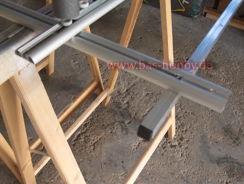 Zwei weitere kürzere Schienenstücke werden zwischen den beiden Grundschienen mit verschiebbaren Rändelschrauben abgebracht. Diese Rändelschrauben lassen sich leicht von Hand lösen und befestigen. Die Schienen sind dadurch schnell und einfach verstellbar. Auf diesen Schienen kommen nun die eigentlichen Modellhalterungen.