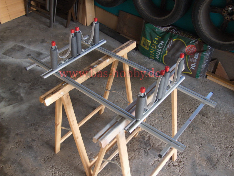 Kleine Strecken mit dem Modellschiffen im Auto, sind eigentlich kein Problem, wenn man einen halbwegs standfesten Modellständer hat. Aber bei größeren Entfernungen, wie zu Veranstaltungen, ist es mir doch zu unsicher. Darum baute ich mit Aluprofilen aus dem Baumarkt, einen verstellbaren Ständer, mit dem ich verschiedene Modelle transportieren kann. Grundlage des Gestells bilden zwei Schienen, wie sie verwendet werden, um Küchenutensilien an die Wand zu hängen. Diese Schienen besitzen mittig eine Nut , an der glatten Wandseite wurden zwei Vierkantprofile angebracht, so dass diese die Schienen parallel und auf Abstand halten.